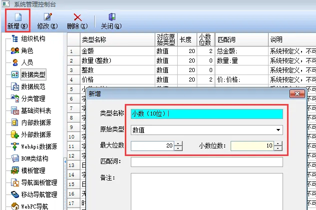 比如你现在想增加一个10个字符的数据类型 ,或一个一个10位小数的数据类型 ,我们都可以自己定义。