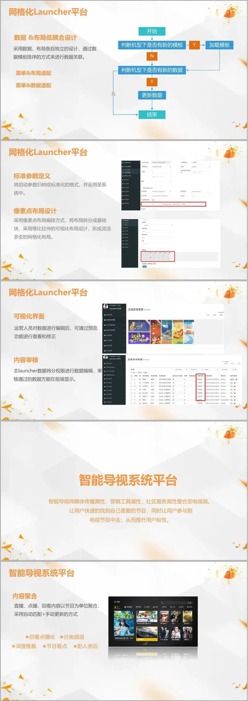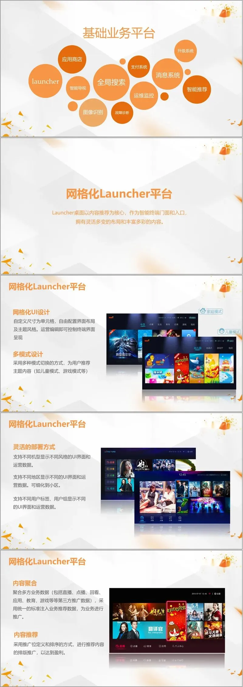 方案的核心入口与用户界面是网格化Launcher平台。它不仅是终端门面,更是以内容推荐为核心的运营阵地。其设计极具灵活性,支持多模式切换(如儿童模式、游戏模式)、像素级网格化布局、可视化运营编辑,并能根据地区、用户标签、机型等维度实现界面与数据的差异化呈现。内容推荐体系聚合了直播、点播、回看、应用、教育等多方业务数据,通过标准化的推广位进行统一编排与投放,实现了运营驱动与商业变现的紧密结合。