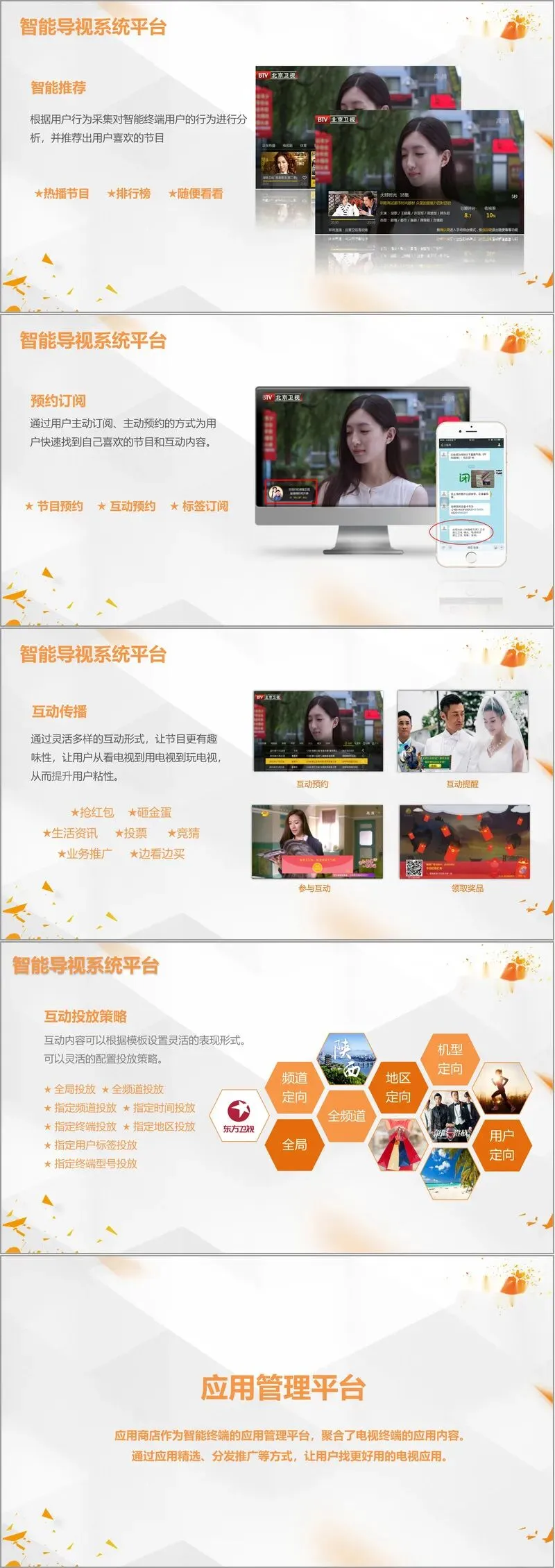 智能导视系统是提升电视交互体验与用户粘性的关键。它超越了传统的节目指南,深度融合了媒体传播、营销工具与社区服务属性。其核心功能包括:以节目为单位的内容聚合(融合回看、分类频道、深度维基、影人资讯);基于用户行为的智能推荐(热播、排行榜);便捷的预约订阅功能;以及形式多样的互动传播体系(如抢红包、砸金蛋、投票、边看边买)。尤为重要的是,互动内容支持高度灵活的投放策略,可从全局、频道、时间、终端、地区、用户标签等多个维度进行精准定向。