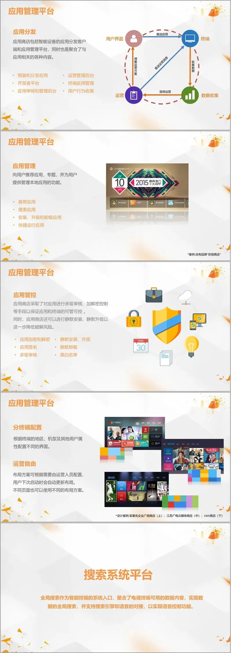 应用商店平台承担着智能终端应用生态的管理与分发职责。它不仅是应用分发客户端,更集成了开发者平台、审核管理后台与运营管理后台。平台强调可管可控,通过多级审核、应用加解密、签名验证、静默安装升级以及黑白名单机制保障安全。同时,运营端支持根据终端属性(地区、机型等)自由配置不同的商店界面与布局方案,实现分众运营。