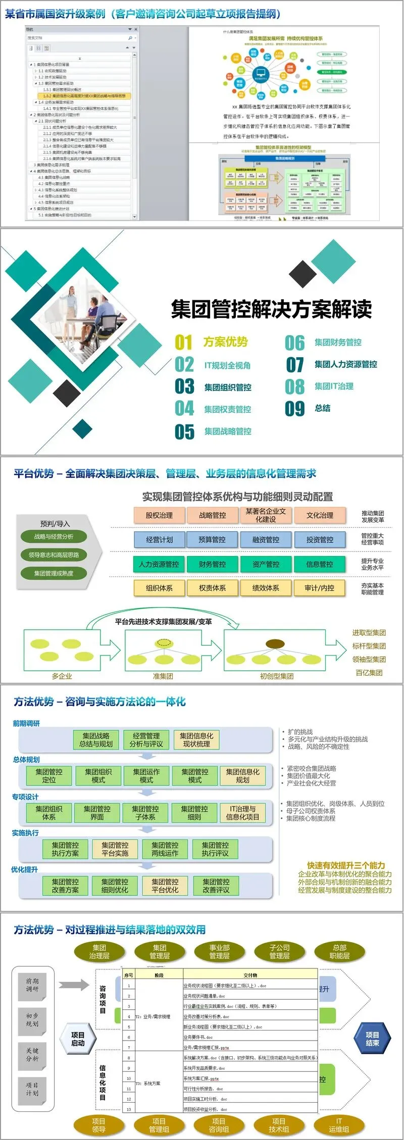 在具体应用上,文件通过丰富的案例(如国商控股、众生药业、上汽集团等)演示了该解决方案在战略管控、财务管控、人力资源管控、计划与绩效管理、投资项目管理以及IT治理等核心领域的应用场景。例如,在战略管控中,平台能构建协同决策支持中心,整合内外数据与情报,支撑战略规划、执行、考核的全过程管理;在财务管控中,可实现预算费控、资金管理、投融资项目的全流程闭环管控。