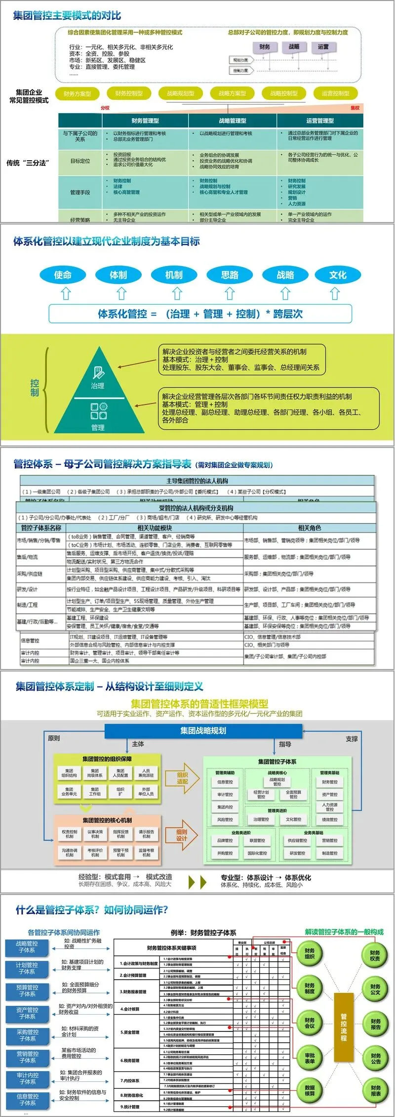 文件深入剖析了集团管控的体系构成,将其分解为政令传达、流程管理、数据规范、业务管理、信息管控、沟通协作、文化建设七大支撑维度,并以财务管控子体系为例,详细展示了从会计政策、预算管理、资金管理到税务、内控、信息化的全流程关键事项与权责划分。这种“子体系”思维,允许企业根据自身战略、产业特点和管控模式,进行灵活定制与组合。