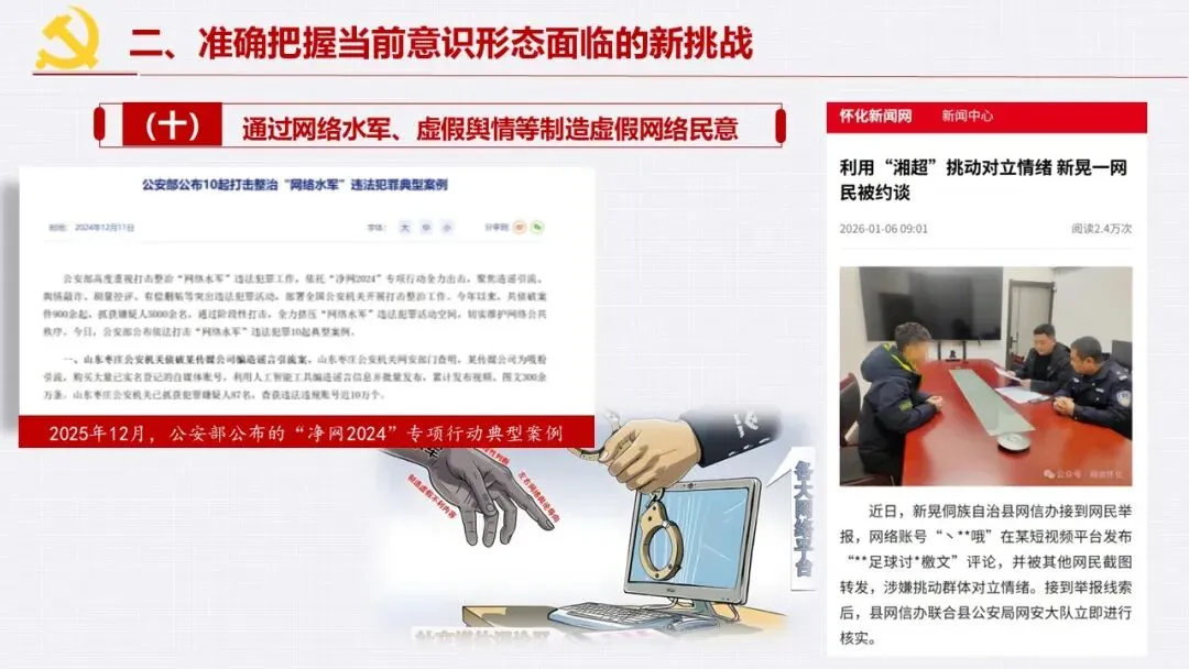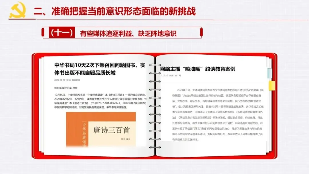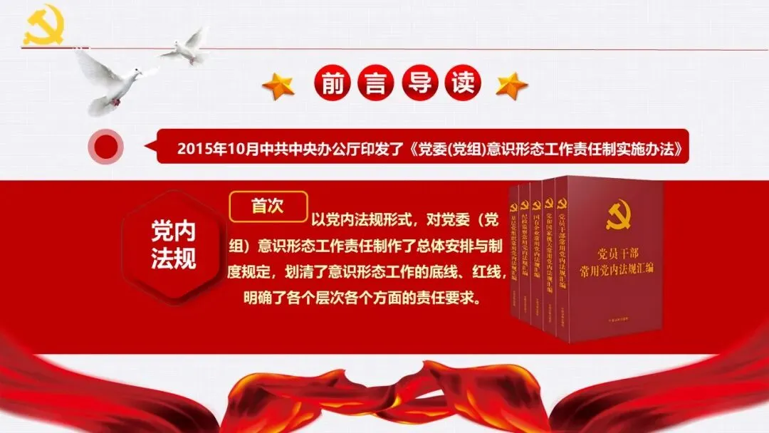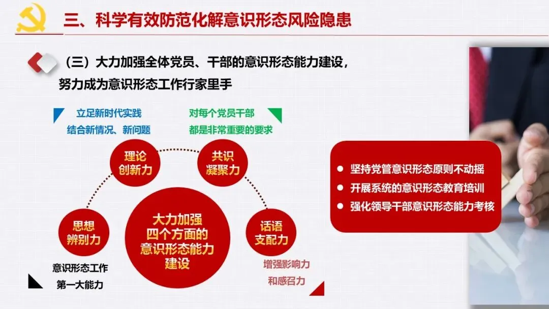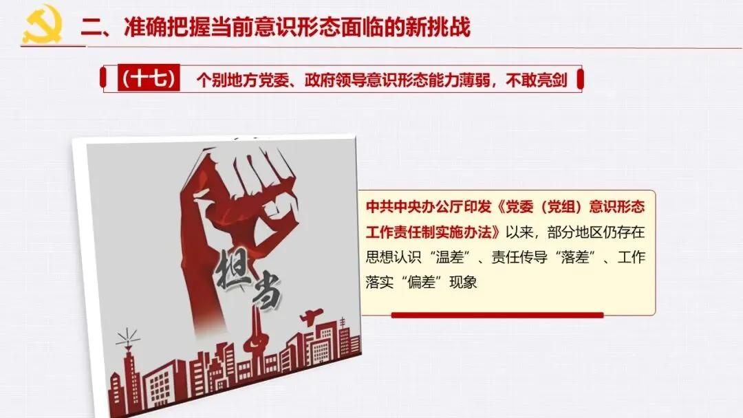 2026年专题学习辅导PPT:全面落实意识形态工作责任制,为推进中国式现代化凝心聚力讲稿侧重案例教学,大量权威官方公开报告的正反案例,加以规范严谨阐释,充分提升思政教学的生动性鲜活性。主要围绕意识形态工作的极端重要性、当前面临的新挑战以及科学有效的应对策略3层面,进行全面深入解读。