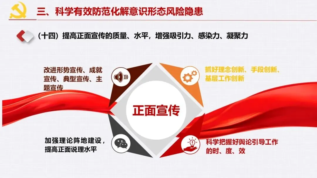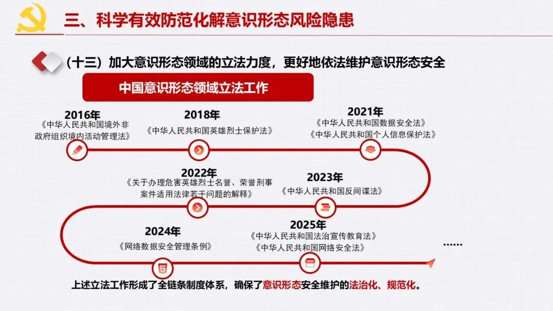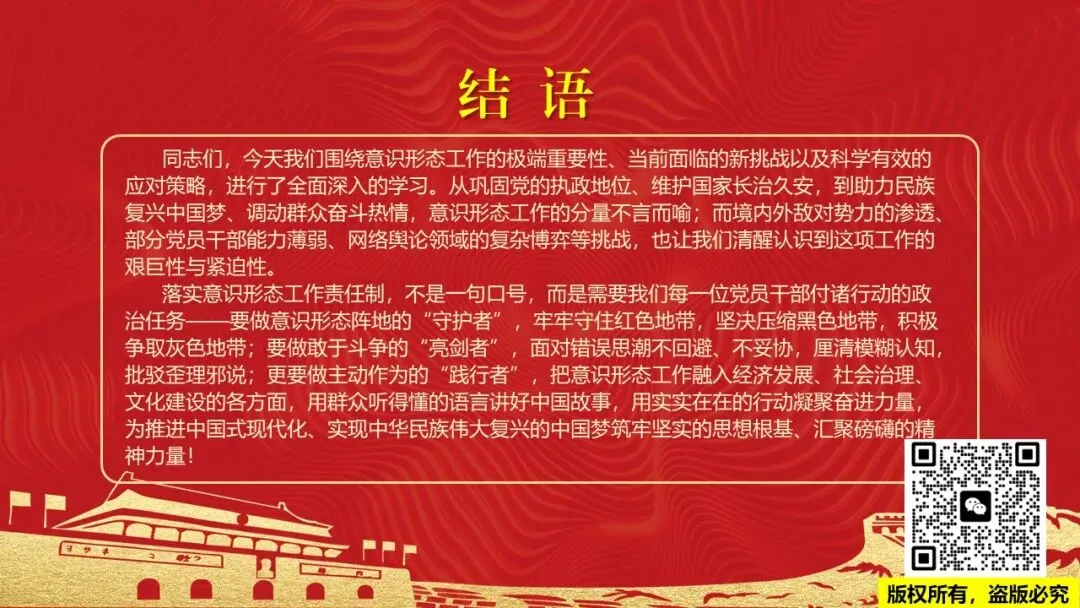 【版权声明】本PPT版设已登记版权保护,提醒警示!交流认准标注原创及时持续更新,其他渠道获取无版权必追究!落实意识形态工作责任制,不是一句口号,而是需要我们每一位付诸行动的政治任务——要做意识形态阵地的“守护者”,牢牢守住红色地带,坚决压缩黑色地带,积极争取灰色地带;要做敢于斗争的“亮剑者”,面对错误思潮不回避、不妥协,厘清模糊认知,批驳歪理邪说;更要做主动作为的“践行者”,把意识形态工作融入经济发展、社会治理、文化建设的各方面,用群众听得懂的语言讲好中国故事,用实实在在的行动凝聚奋进力量,为推进中国式现代化、实现中华民族伟大复兴的中国梦筑牢坚实的思想根基、汇聚磅礴的精神力量!
