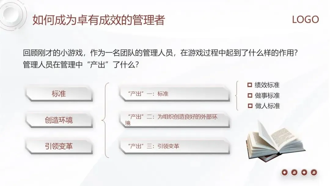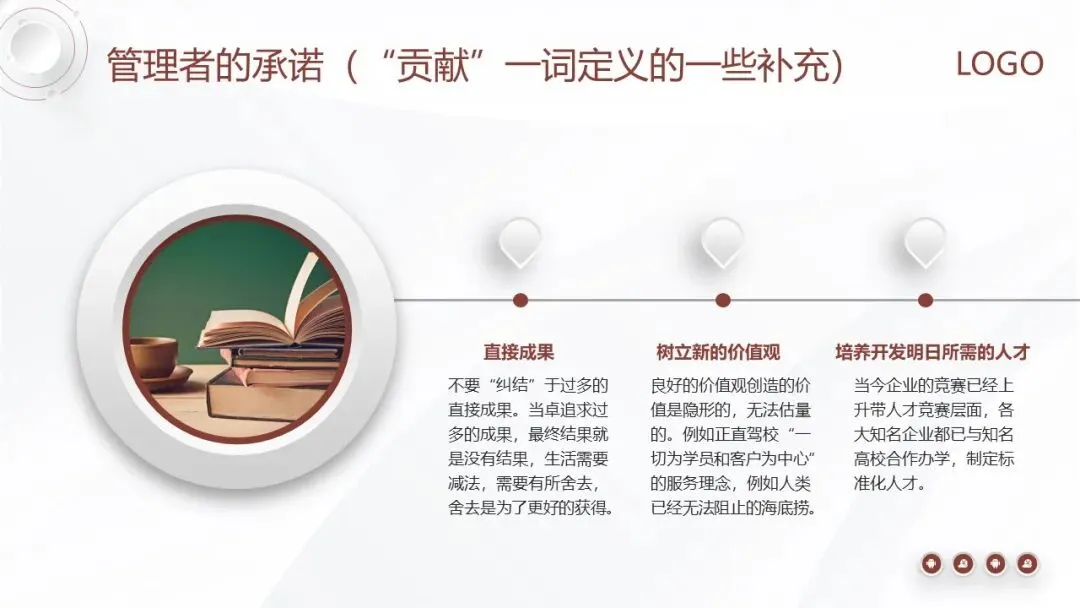 管理者的贡献体现在三个层面:一是创造直接成果,如销量、利润的增长;二是树立正确的价值观和标准,引导团队方向;三是培养人才,为组织的未来储备力量。