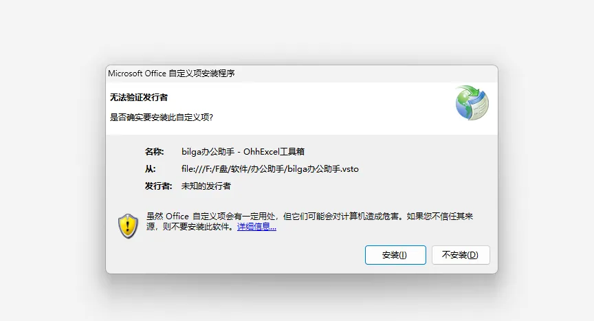 安装后,打开Excel时,系统会提示是否安装程序,点击安装即可。