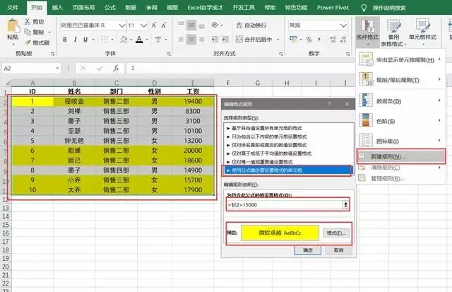 如下表,对于左边工资数据,想要工资大于1万5的数据,首行全部自动标为黄色,可先选中数据区域,之后依次点击条件格式,新建规则,在规则中,输入公式: