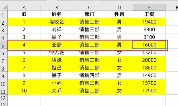 当条件格式设置之后,只需改动E列工资,当大于1万5时,即会自动标黄,小于1万5时,即会自动清除颜色。