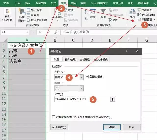 此公式即是对A列执行计数,当计数小于等于1时,才会被输入。