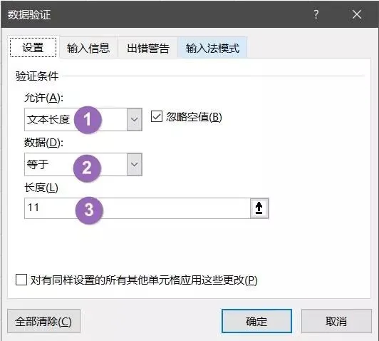 当录入手机号码时,常会发现手机号少了1位,或多了1位,为避免此种情况发生,可提前在表格中,限制仅能输入11位数字。