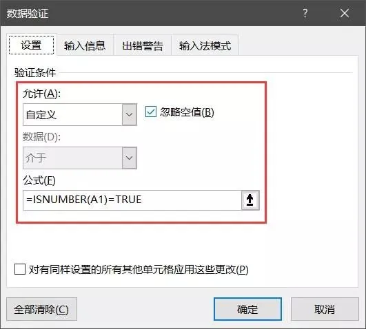 即判断A1是否为数字,若返回是TRUE,才可以输入。