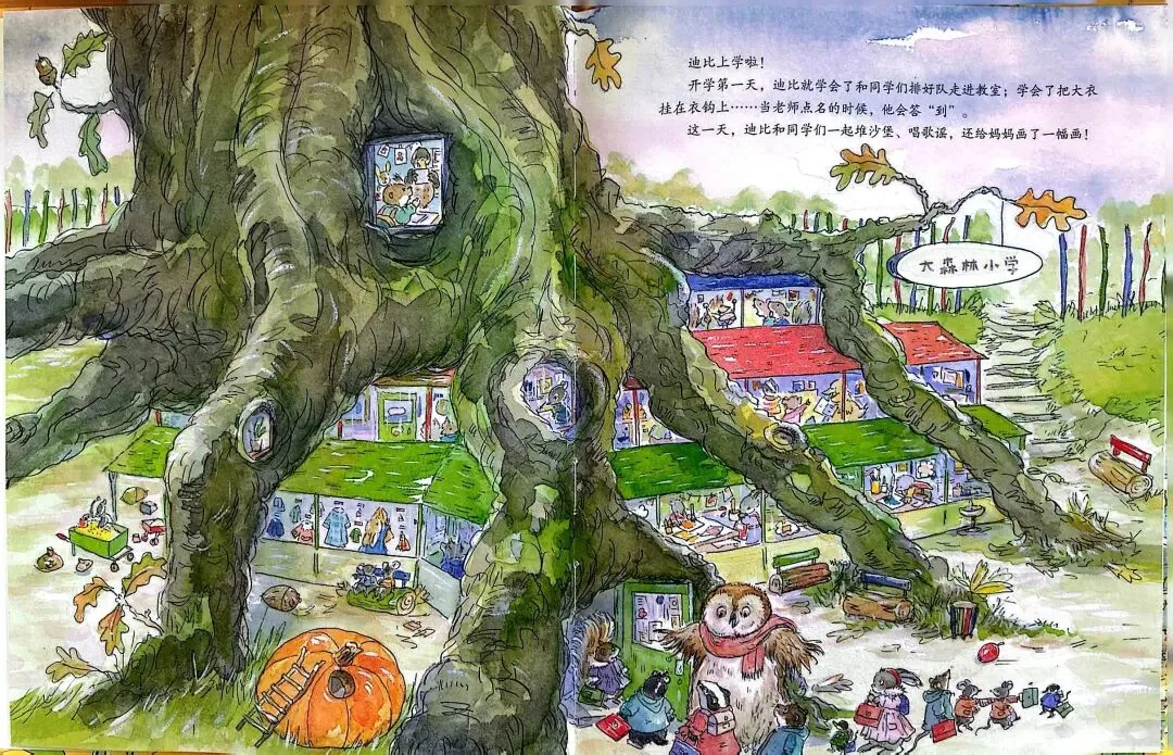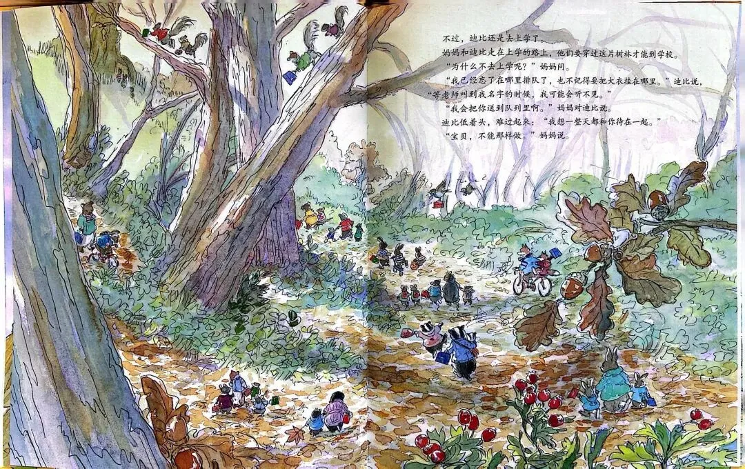 不过迪比还是去上学了。妈妈和迪比走在上学的路上,他们穿过这片树林才能达到学校。