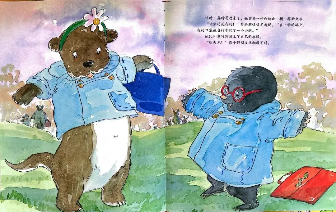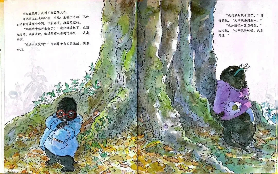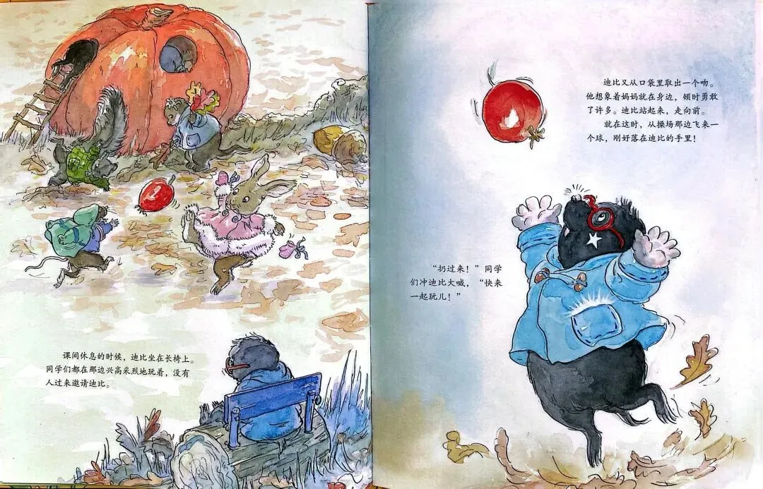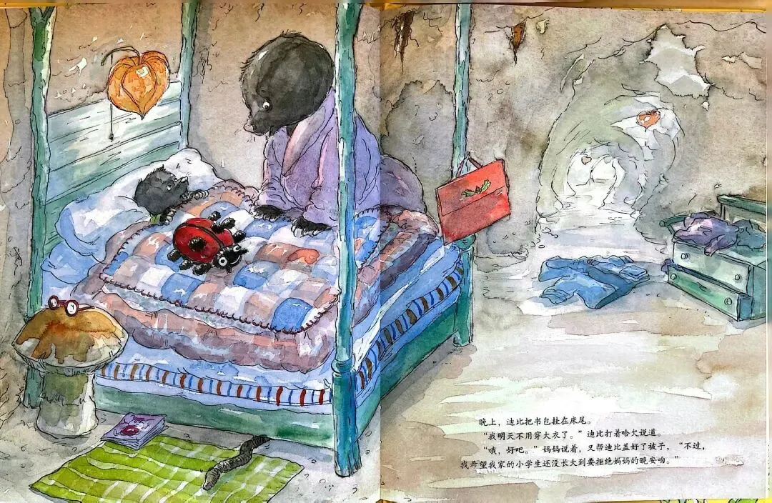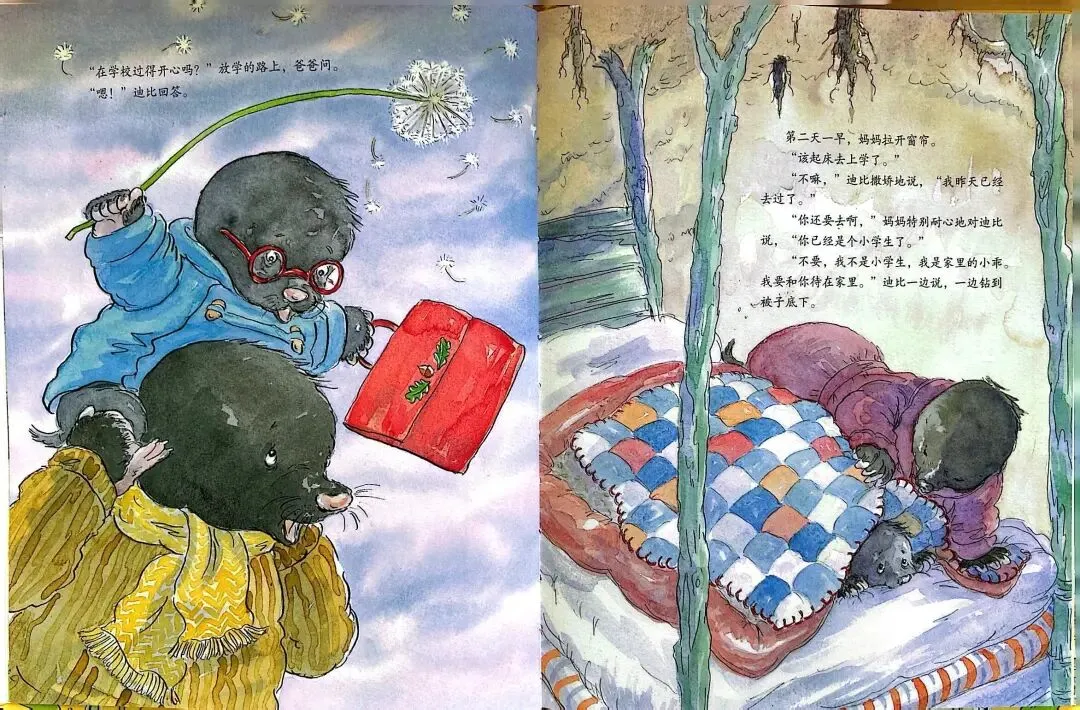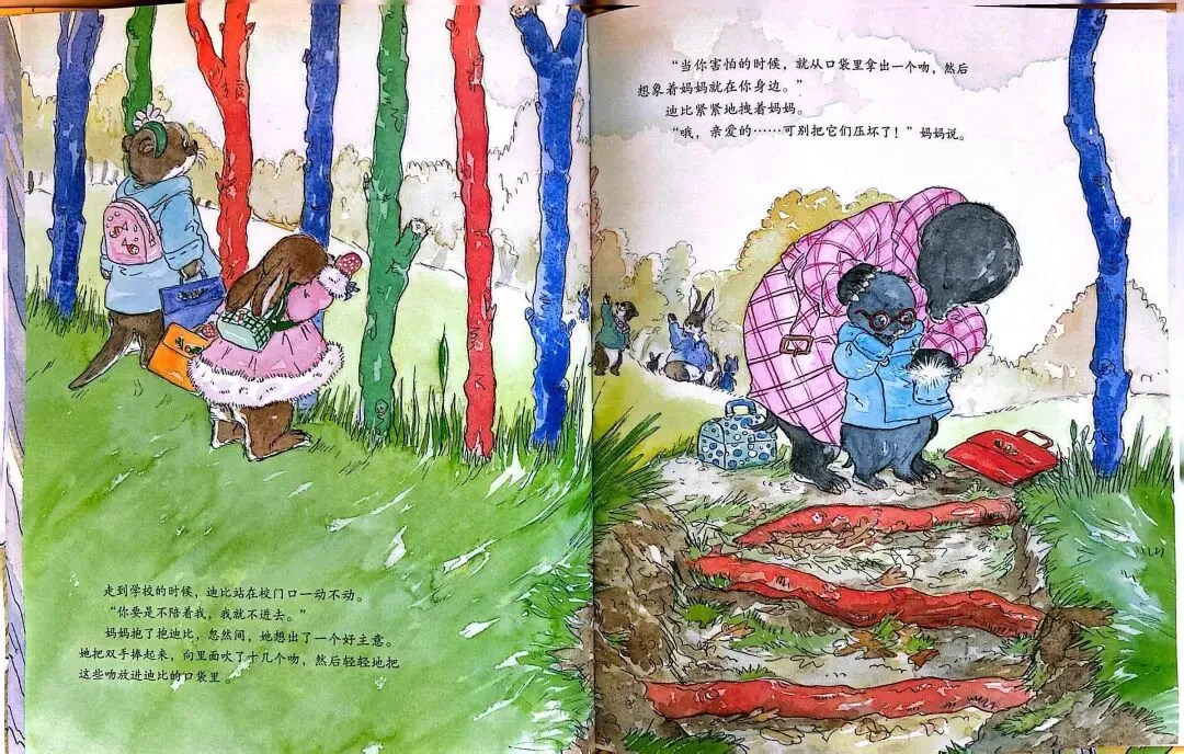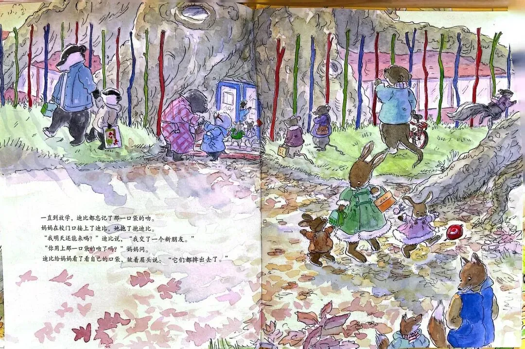 《一口袋的吻》由英国作家安杰拉·迈克奥里斯特撰文、苏·海拉德绘图,是缓解儿童分离焦虑的经典绘本。故事围绕小鼹鼠迪比的上学适应之旅展开: