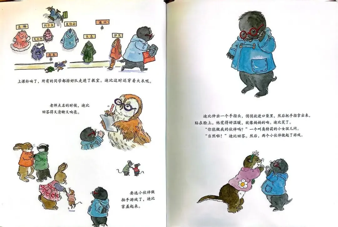 上学第一天,迪比就学会了和同学们排好队走进教室,学会了把大衣挂在衣钩上……当老师点名的时候,他要回答“到”。