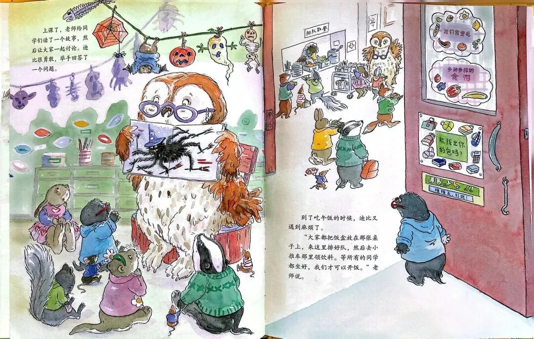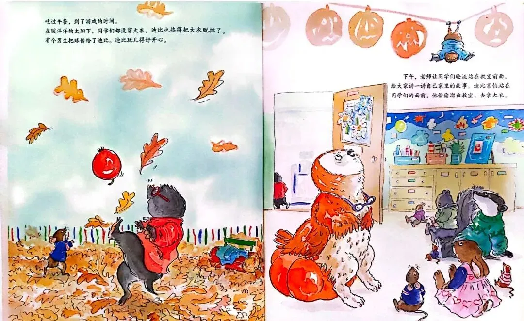 下午,老师让同学们轮流站在教室前面,给大家讲一讲家里的故事。迪比害怕站在同学们的前面,他偷偷溜出教室,去拿大衣。