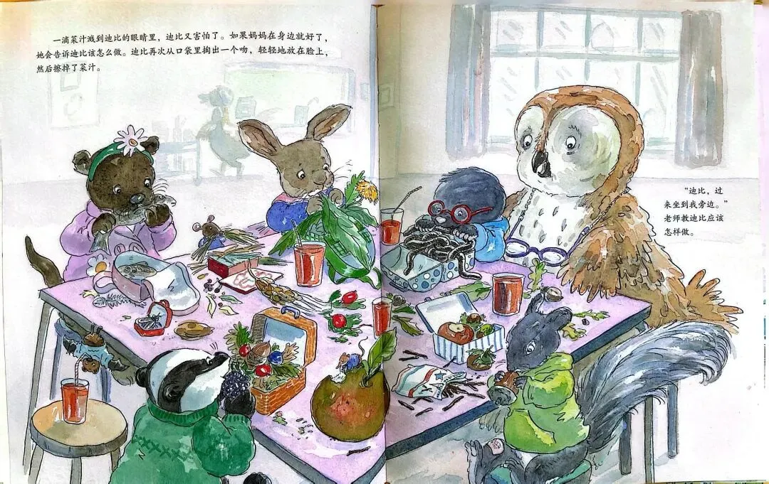 一滴菜汁溅到了迪比的眼睛里。他又害怕了。如果妈妈在身边就好了,她会告诉迪比该怎么做。迪比又从口袋里拿出一个吻,轻轻放在脸上,然后擦掉了菜汁。