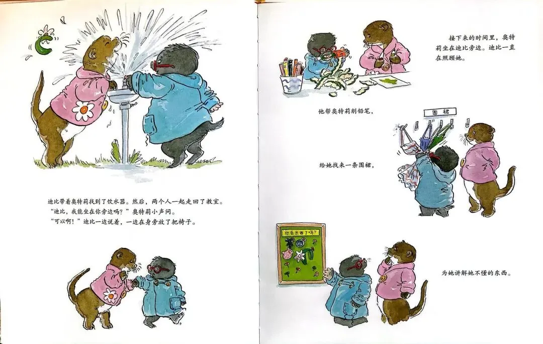 迪比带着奥特莉找到了饮水器。然后,两人一起走回教室。