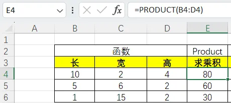 Product写法1:输入单元格区域(B4:D4,第4行,BCD三个数)