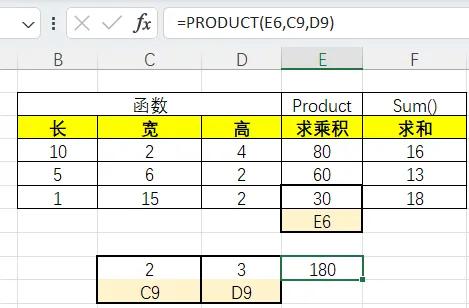 Product写法2:(E6,C9,D9),相比于=E6*C9*D9,不用输入多次*。