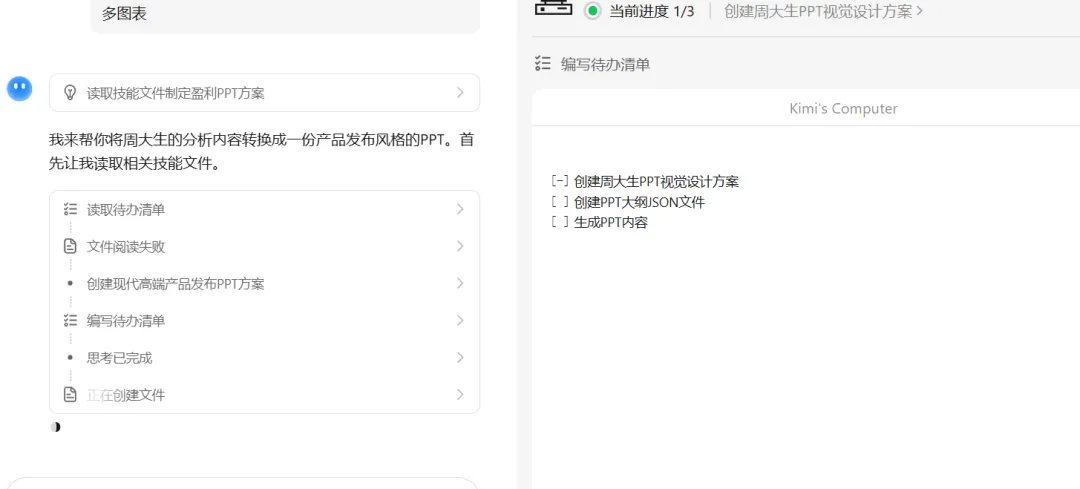 不同于仅停留在对话层面的AI助手,Kimi Agent强调“从对话到交付结果”的完整闭环。它生成的不仅是文字建议,而是可直接使用的办公文档、可运行的代码或包含数据可视化的分析报告。不足一:修改交互有待优化