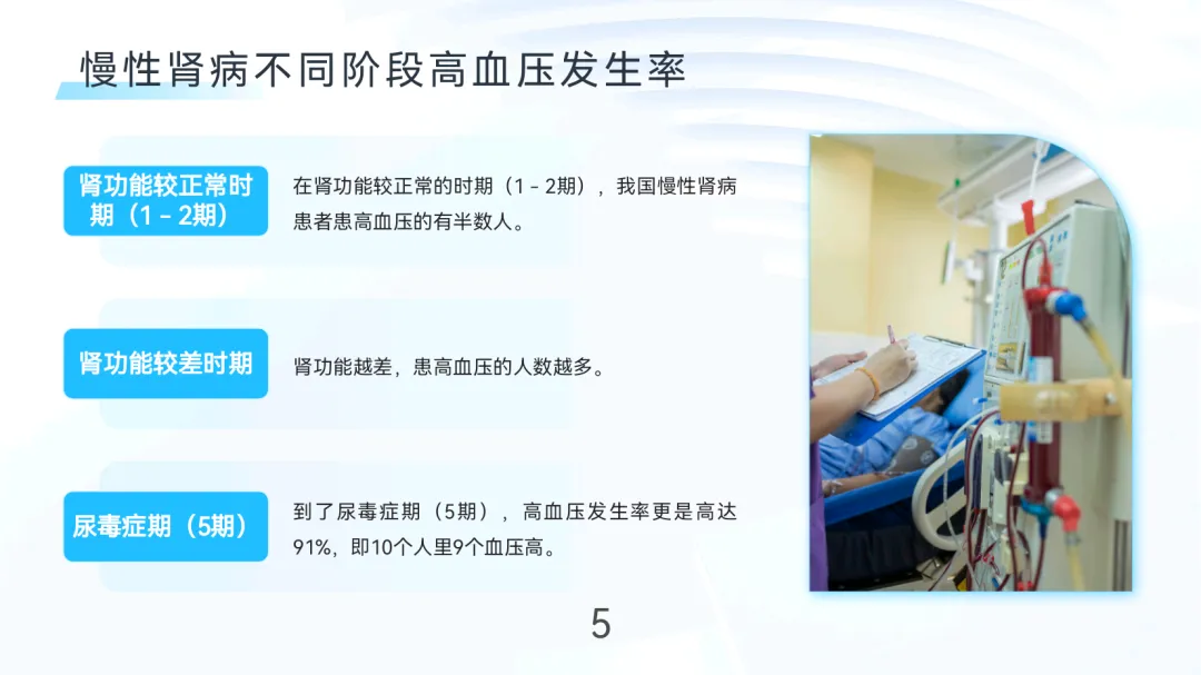 血液透析患者高血压发生率高且危害严重。诊断标准为未用药时非同日3次血压≥140/90mmHg。发生率随肾功能恶化递增:慢性肾病1-2期约50%,尿毒症期(5期)高达91%。其病因复杂,核心机制包括: