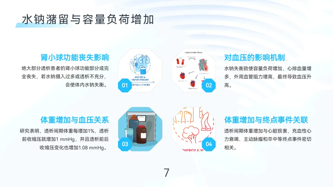 水钠潴留:肾小球功能丧失致水钠排泄障碍,体重每增1%收缩压升1mmHg;