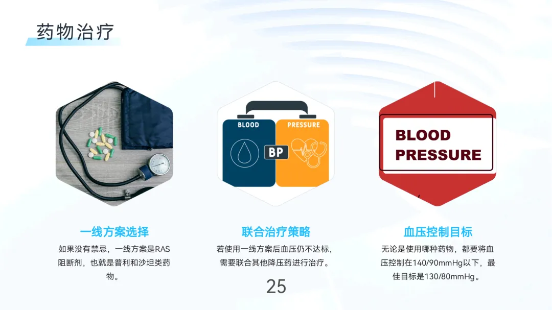 首选RAS阻断剂(普利/沙坦类),必要时联用其他降压药;