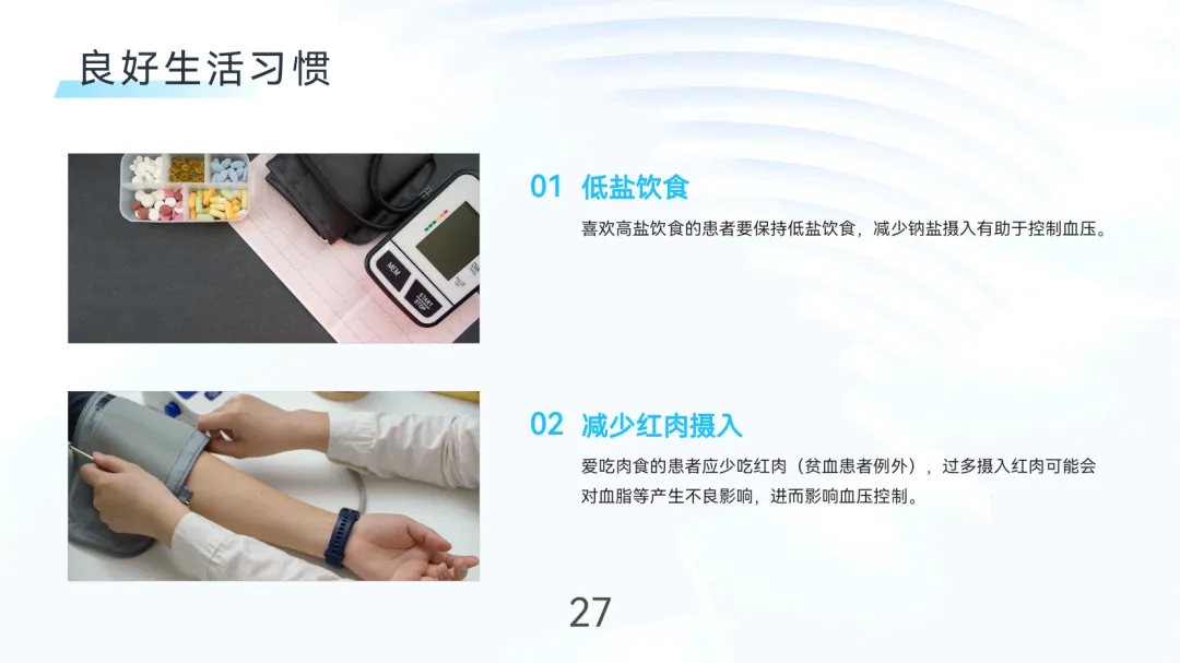 低盐饮食、减重、规律运动、戒烟酒;