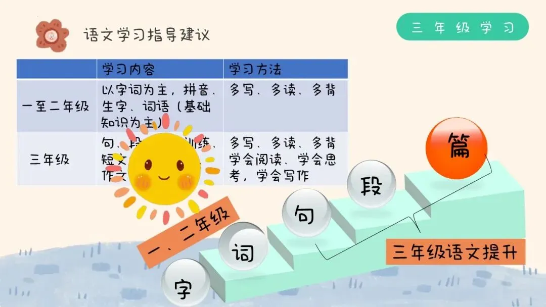 三年级语文学习内容主要包括句、段、篇的训练、短文的阅读理解、作文,学习方法需要多写、多读、多背,学会阅读、学会思考,学会写作。