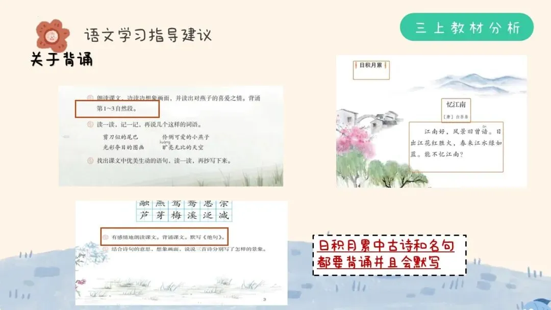 背诵内容增加:日积月累中的古诗、名句都需要背诵并且会默写;