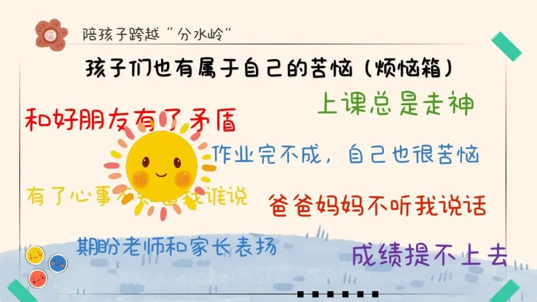 其实,孩子也有他们的烦恼:和好朋友有了矛盾、作业完不成自己也很苦恼、有了心事不知道找谁说、上课总是走神、爸爸妈妈不听我说话、期盼老师和家长表扬、成绩提不上去……
