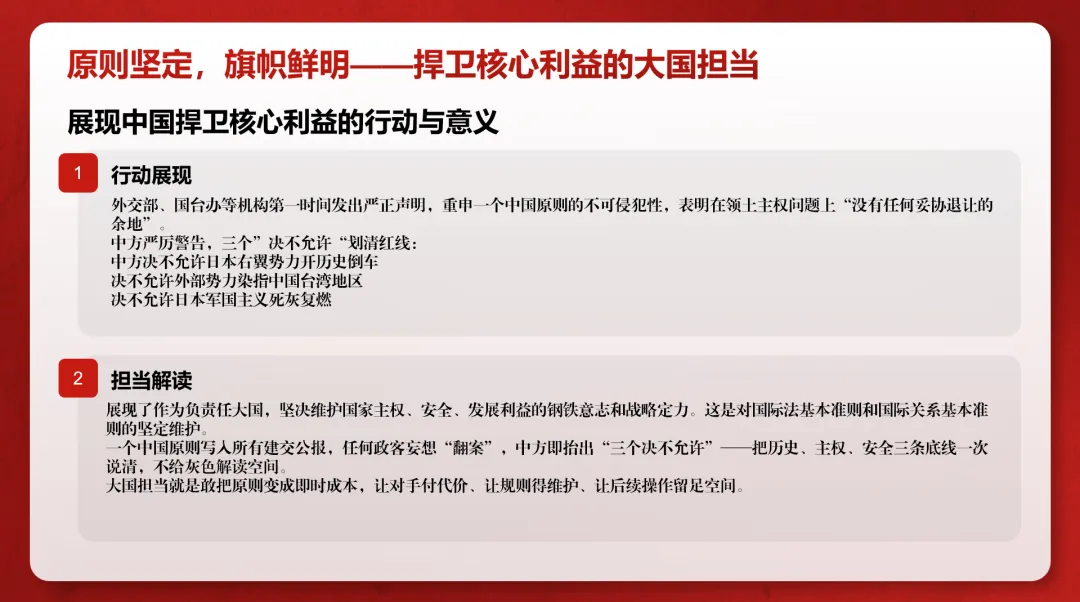 Firm and Clear Principles: On issues concerning national sovereignty and territorial integrity, China's response was clear and forceful, reaffirming its principled stance and demonstrating a firm will to safeguard national unity.