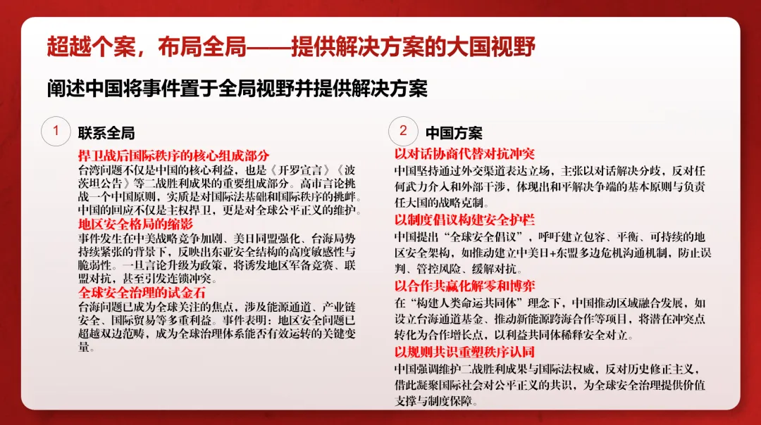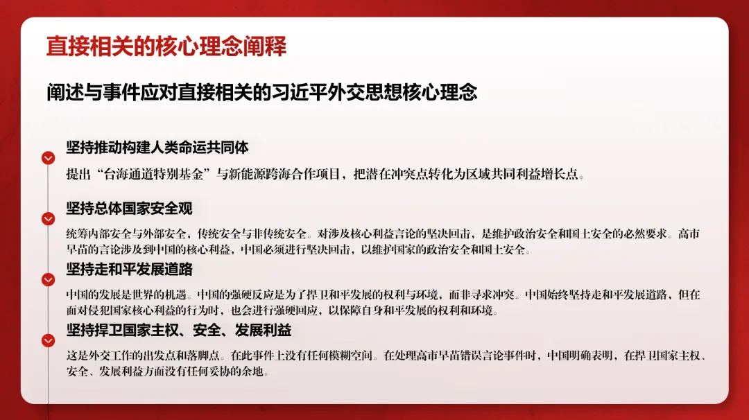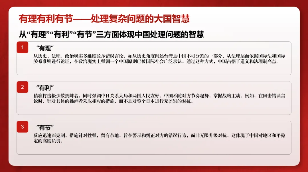 Emphasizing Strategic Confidence and Resolve: Facing provocations, China did not follow the crowd but maintained its response rhythm and initiative.These concepts are not abstract theories but are translated into observable strategies and actions in specific diplomatic interactions.