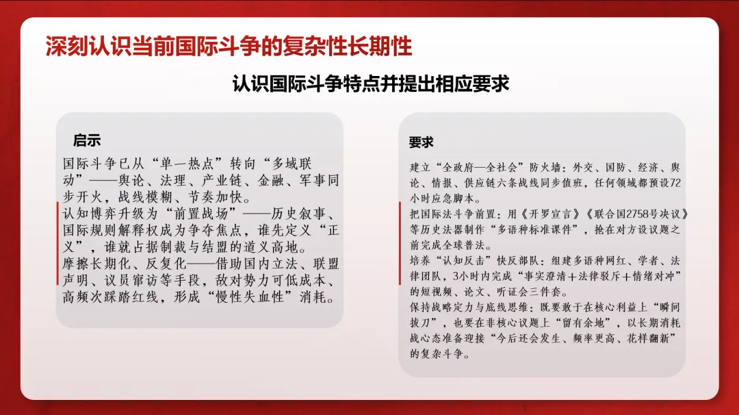 1.国际斗争的形态正在演变冲突不再局限于军事或外交单一领域,而常表现为舆论、法律、供应链、金融等多条战线联动,且博弈节奏加快、边界模糊。