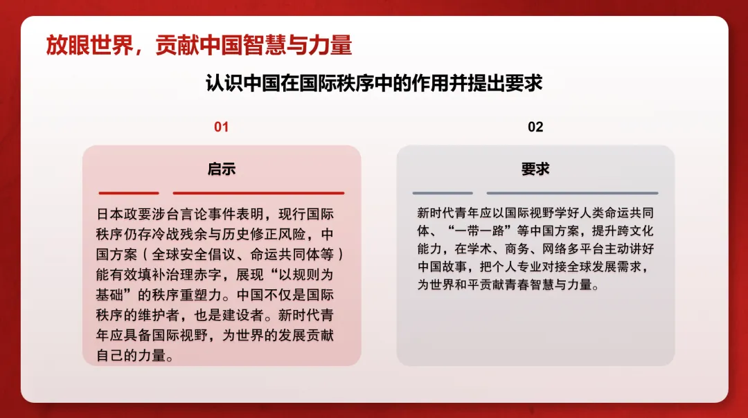 Foster a sense of responsibility to rationally convey observations and thoughts of Chinese youth in international exchanges and daily expressions.