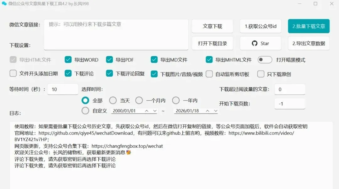 它不仅支持单篇下载,最强的是它的批量下载能力,支持导出HTML、Word、PDF甚至Markdown格式。你甚至可以在文件里自动加上日期、评论,功能非常细致。