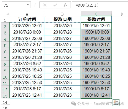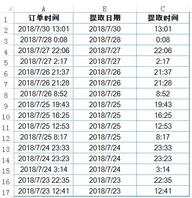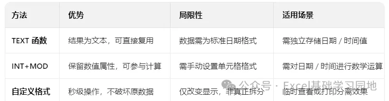 原理:利用Excel“日期本质是数值”的特性(整数部分为日期序列值,小数部分为时间占比)拆分数据。