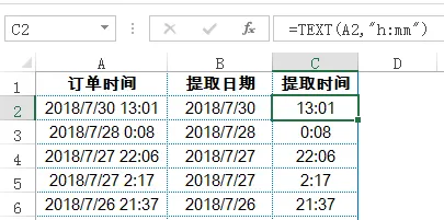 公式解析:`h:mm`为时间格式代码,提取小时与分钟(如“13:01”),`h`表示24小时制。