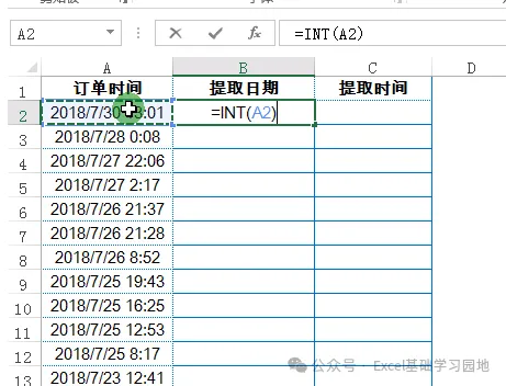 在Excel数据处理中,常需从系统导出的“日期+时间”混合数据中提取独立的日期和时间。