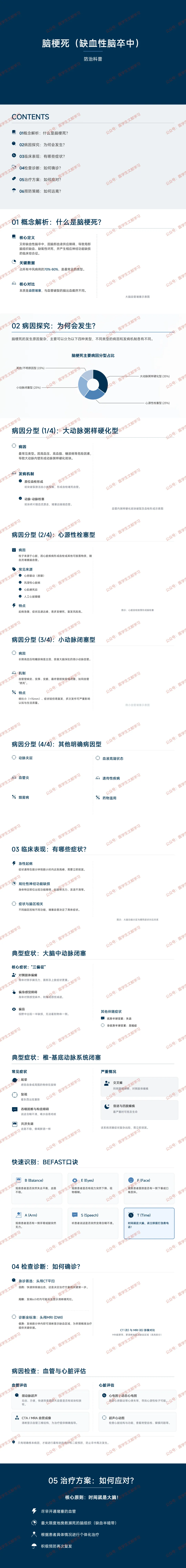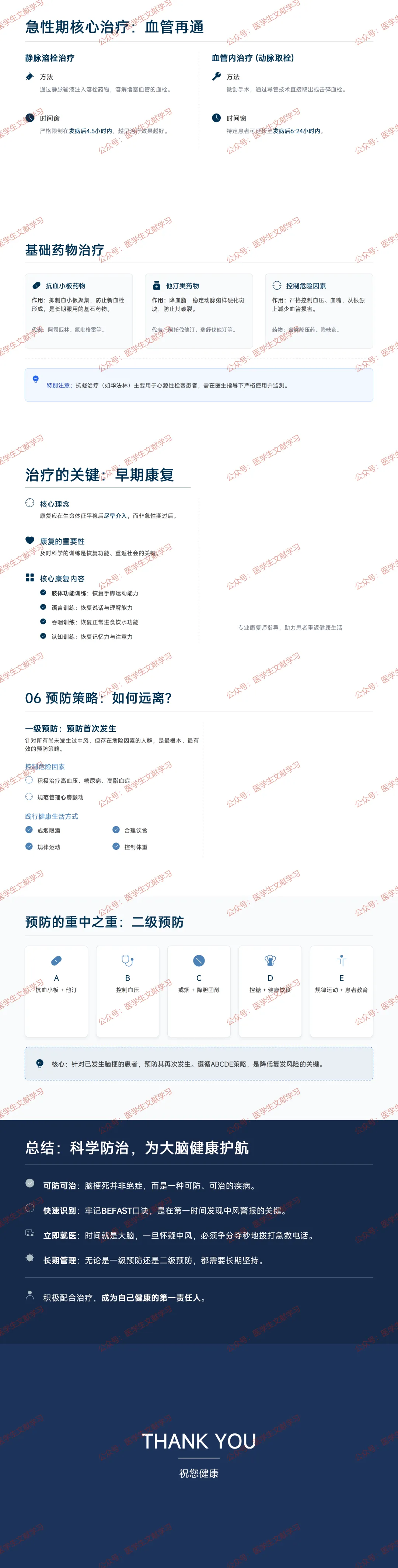 脑梗死是脑部血液供应障碍导致的局部脑组织缺血缺氧坏死,占所有中风的 70%-80%,核心防控逻辑为 “早识别、快开通、长预防”,及时干预可显著降低致残率与复发风险。