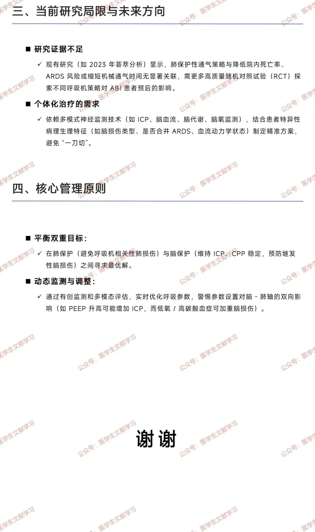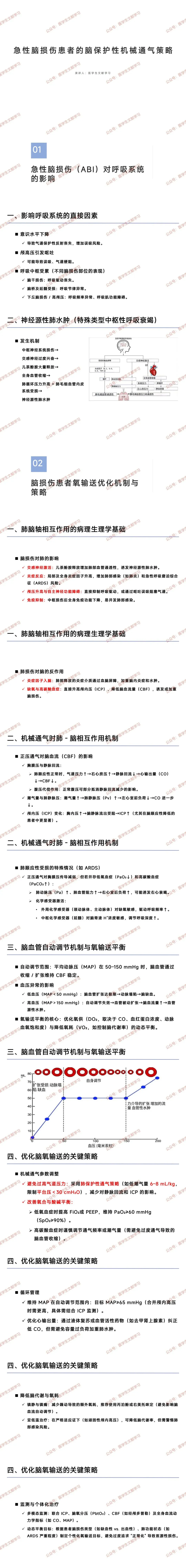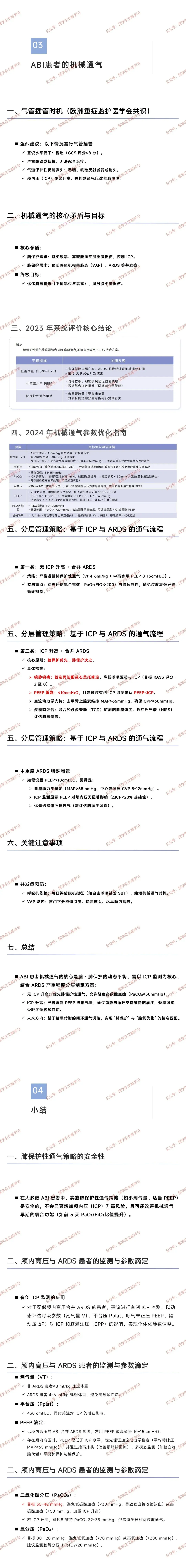 | 无 ICP 升高:根据肺顺应性滴定(如 ARDS 患者可至 10-15cmH₂O);ICP 升高:≤10cmH₂O,且需满足 PEEP<ICP、MAP>65mmHg;抬高床头 30°-45° 以促进颈静脉回流 |
