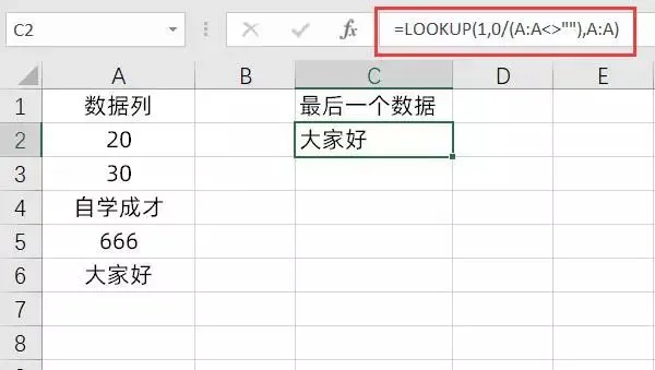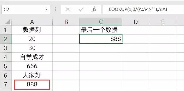 但当数据中既有文本,又有数字时,还需查找最后一个数据时,就无法查找了,此时,使用Lookup即可求出结果: