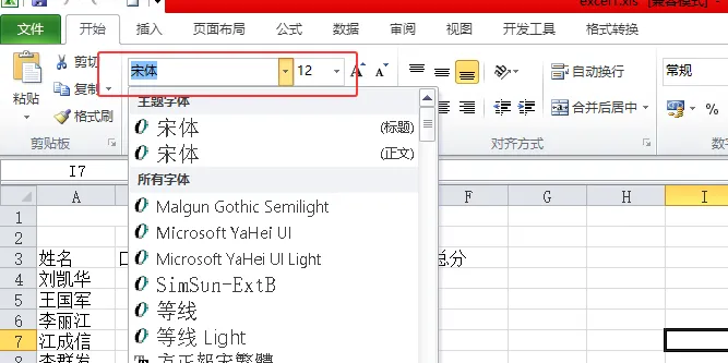 ①“开始”选项卡 → “字体”组 → 字体下拉菜单(如 “宋体”)