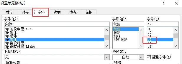 ②同上“设置单元格格式”→ “字体” → 字号列表 调整文字大小(磅值越大,文字越大;常用12磅为默认正文大小)