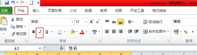 Excel字体倾斜方法① “开始”选项卡 → “字体”组 →倾斜按钮