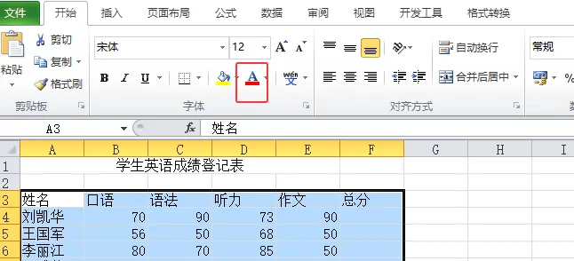 更改字体颜色方法① “开始”选项卡 → “字体”组 → 字体颜色按钮(A带红色下划线)