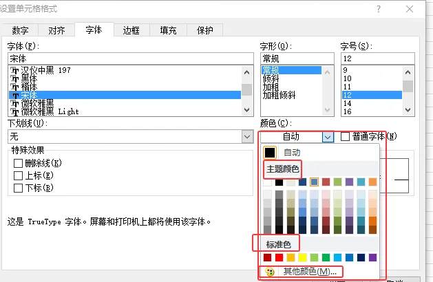 更改字体颜色方法② 同上“设置单元格格式” → “字体” → “颜色”下拉菜单 改变文字颜色(默认黑色,可选择主题色、标准色或自定义RGB颜色) 点击按钮默认应用上次颜色,下拉可选新色 。