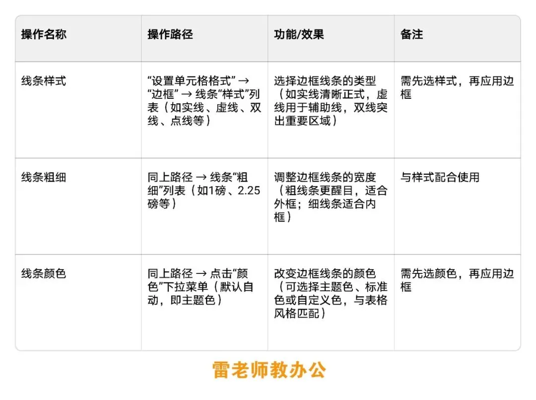 (核心作用:划分数据区域、增强表格层次感,通过“边框”设置定义单元格边缘线条)