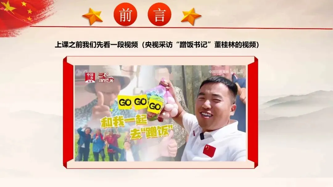 上课之前我们先看一段视频(央视采访“蹭饭书记”董桂林的视频)。