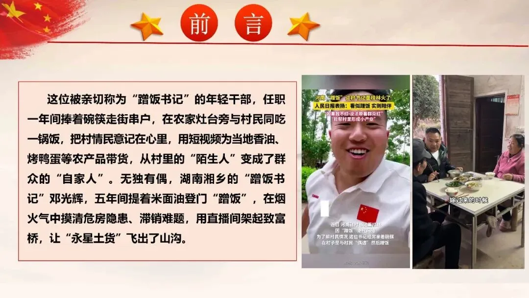 刚才视频里,董桂林书记捧着饭碗坐在村民炕头拉家常的画面,是不是让大家心里一暖?那些在灶台边记录的民情笔记、直播间里卖力推销农产品的身影,没有惊天动地的壮举,却在一餐饭、一句话、一件事中,让我们看到了新时代年轻干部最动人的模样。这位被亲切称为“蹭饭书记”的年轻干部,任职一年间捧着碗筷走街串户,在农家灶台旁与村民同吃一锅饭,把村情民意记在心里,用短视频为当地香油、烤鸭蛋等农产品带货,从村里的“陌生人”变成了群众的“自家人”。无独有偶,湖南湘乡的“蹭饭书记”邓光辉,五年间提着米面油登门“蹭饭”,在烟火气中摸清危房隐患、滞销难题,用直播间架起致富桥,让“永星土货”飞出了山沟。